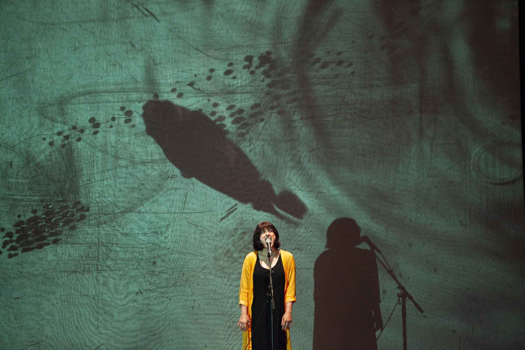 La voce nuda nello spazio o amplificata al microfono ha aperto paesaggi sonori intimi, è andata in esplorazioni di dimensioni impreviste della voce e dei suoi ricordi. La voce ha preso parola in una scena che è diventata casa per le immagini nate dall’uso della lavagna luminosa che in tempo reale ha costruito scenografie oniriche e senza tempo, luoghi nascosti dentro di noi o nelle piccole cose della natura, sogni, ombre, ma anche qualcosa di noi proiettato in avanti nel futuro. Cosa farai da grande? Per cosa vale la pena vivere, essere qui? Forse per raccogliere le parole, i colori del mondo e darle poi agli altri, perché altrimenti alla fine rimarremo senza nulla da dirci come diceva il topolino Federico nella favola di Leo Lionni. La voce umana è un dono che portiamo con noi in questo viaggio da fare insieme forse per dire a chi sta dall’altra parte del filo “ascolta come mi batte forte il tuo cuore”.